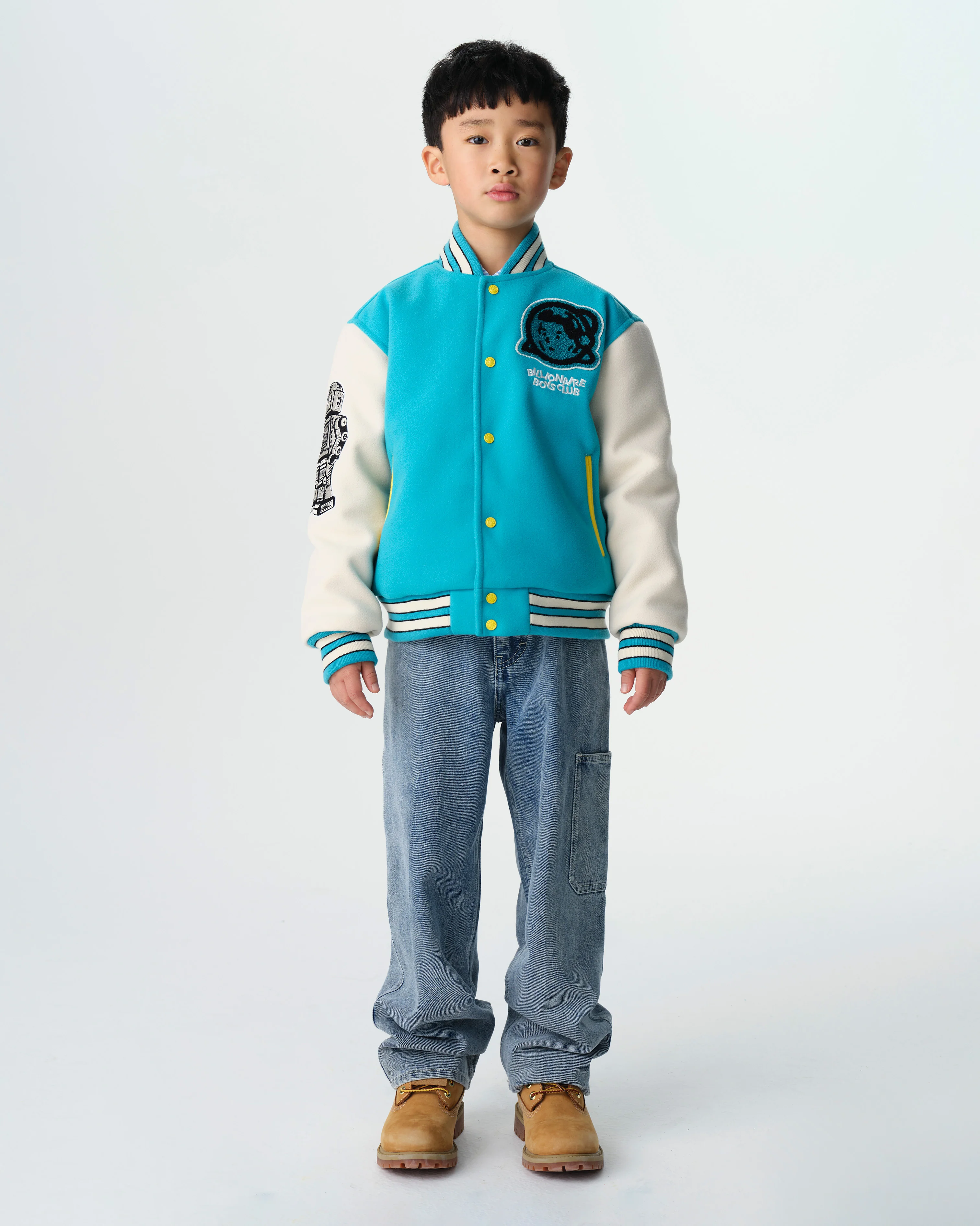 Billionaire Boys Club Kids Collection - Made in the classic Billionaire Boys Club Varsity Jacket style, this Kids Astro Varsity Jacket features a chenille astro helmet logo patch and embroidered Billionaire Boys Club logo at chest, embroidered robot at right sleeve and a chenille astro helmet logo patch at back.