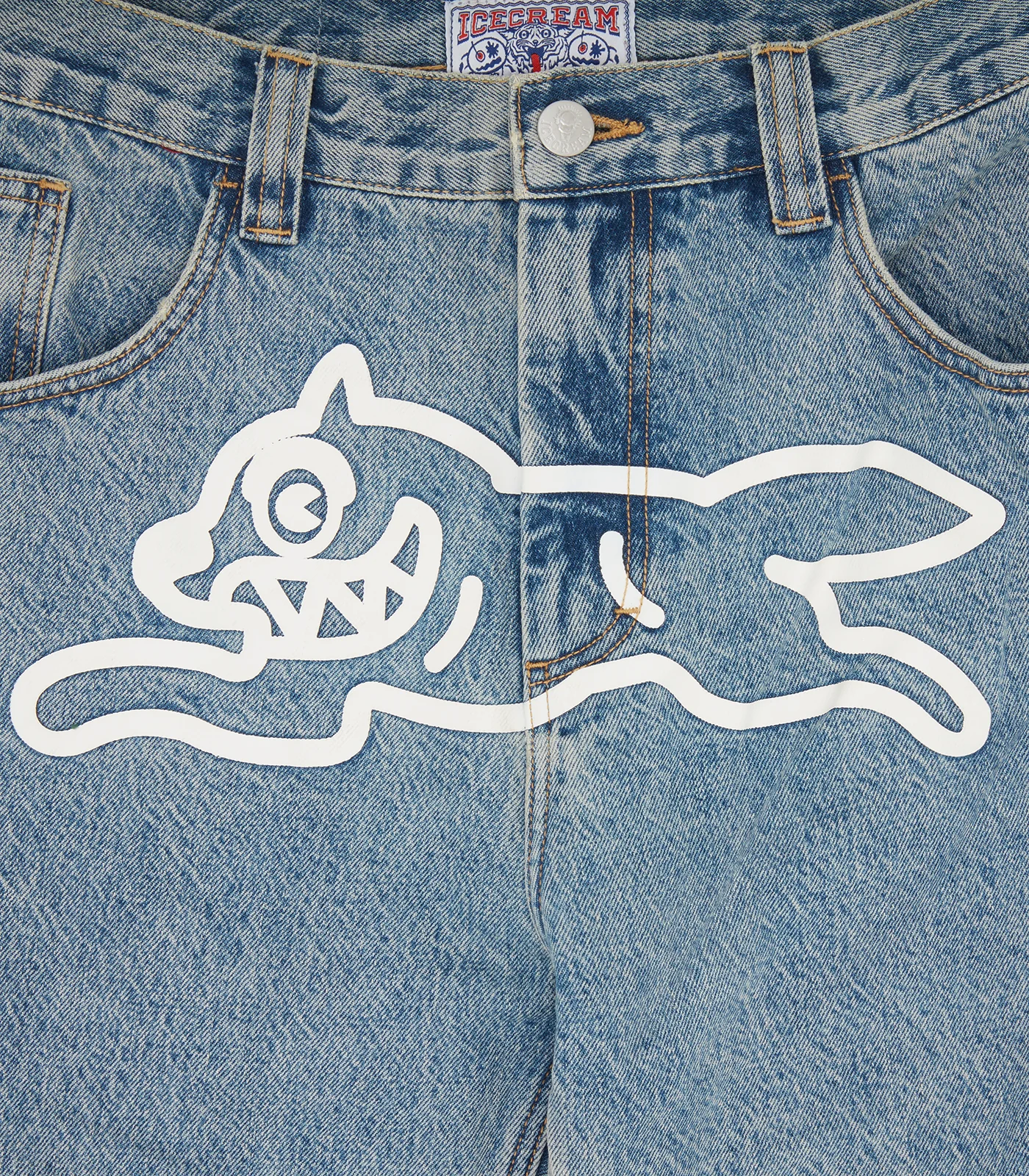 ICECREAM Pre-Spring '25 - Check Lined Denim Pants features the iconic screen printed Running Dog graphic on the front, embroidered IC logo with matching denim jacket available.
