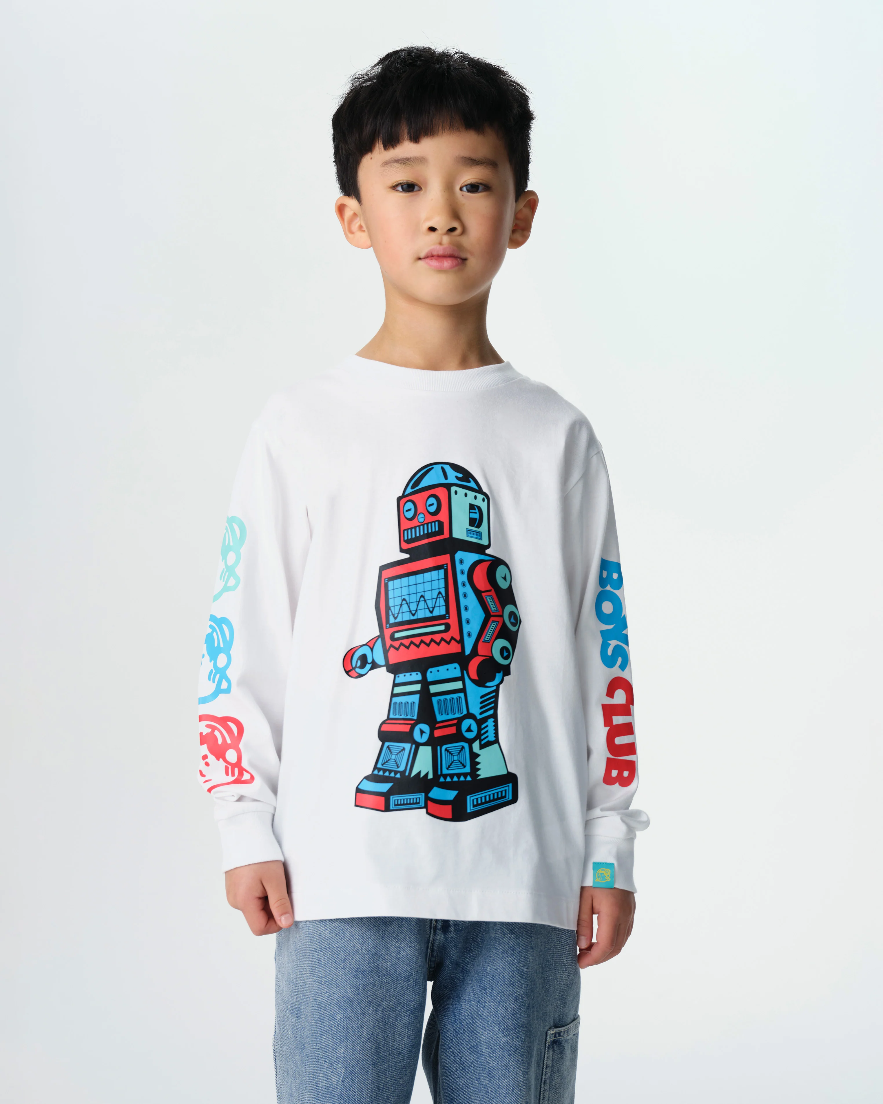 Billionaire Boys Club Kids Collection - This Kids Robot LS T-shirt is made of 100% cotton and features a screen-printed walking robot on the front. It is detailed with the printed Astro logo on the back neck and the right sleeve, while the left sleeve showcases the printed Billionaire Boys Club block logo.