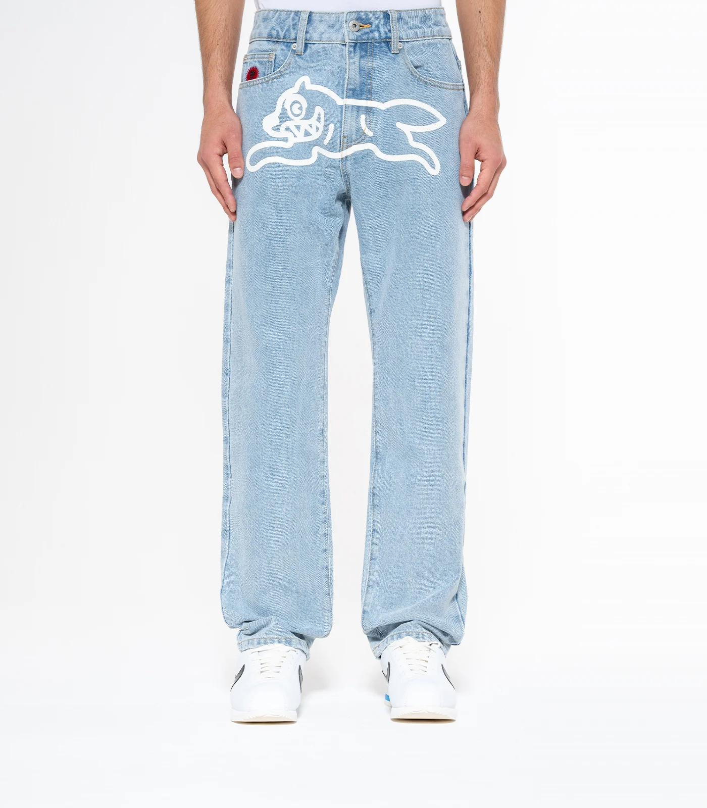 ICECREAM - Running Dog Denim Pants, feature a screen-printed running dog graphic on the front, embroidered IC signet, embroidered "IC" lettering on the back pockets, and a zip-fastened fly.