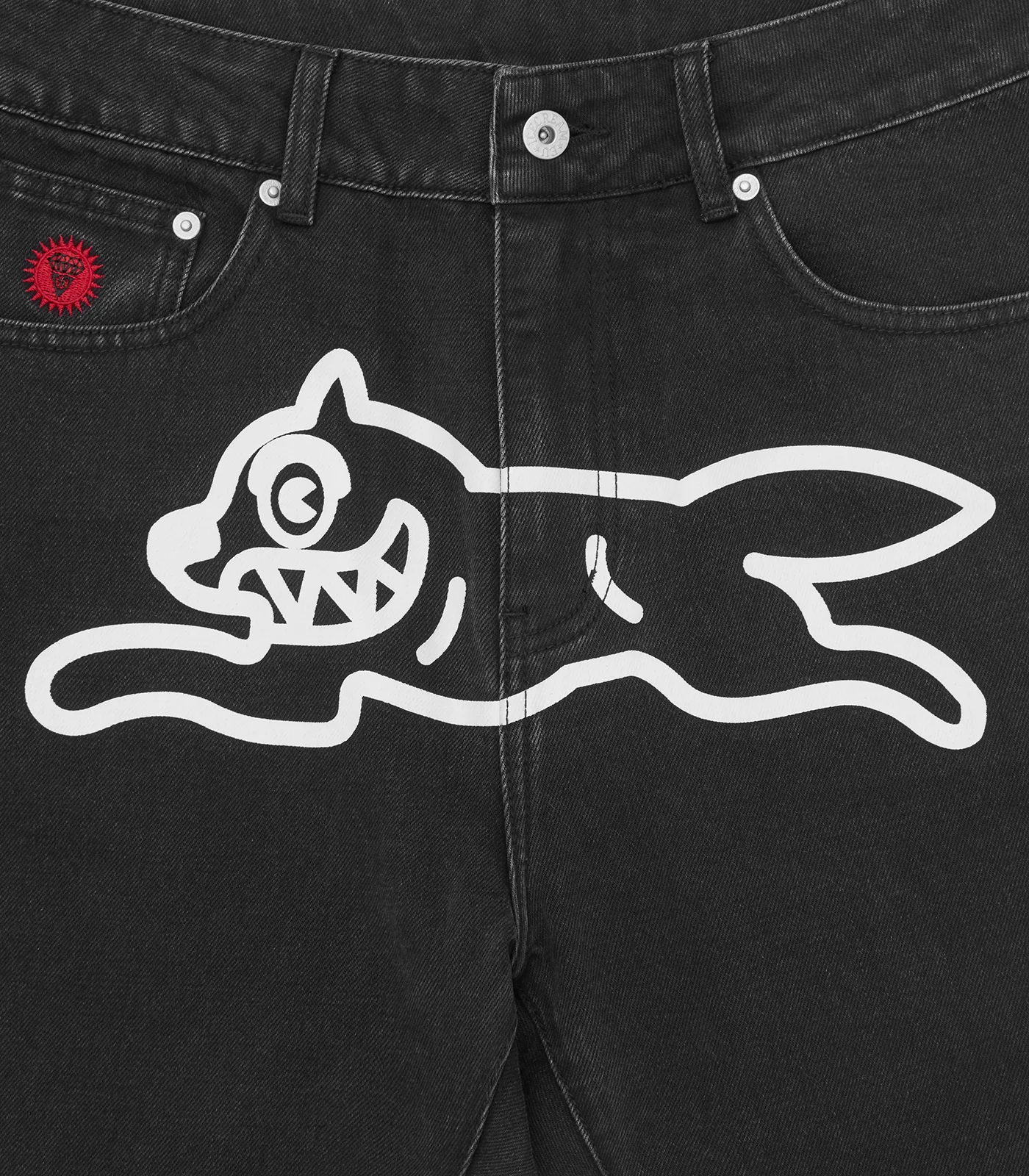 ICECREAM Fall '25 - Running Dog Denim Pants, feature a screen-printed running dog graphic on the front, embroidered IC signet, embroidered "IC" lettering on the back pockets, and a zip-fastened fly.