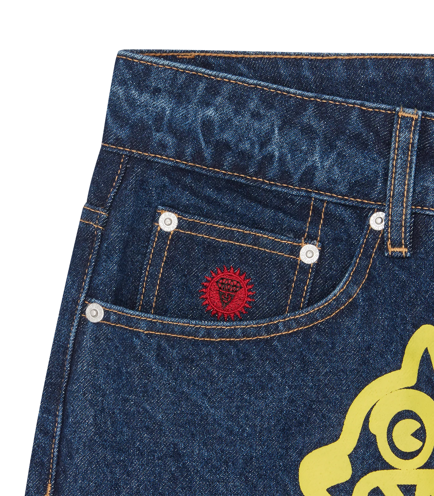 ICECREAM Fall '25 - Running Dog Denim Pants, feature a screen-printed running dog graphic on the front, embroidered IC signet, embroidered "IC" lettering on the back pockets, and a zip-fastened fly.