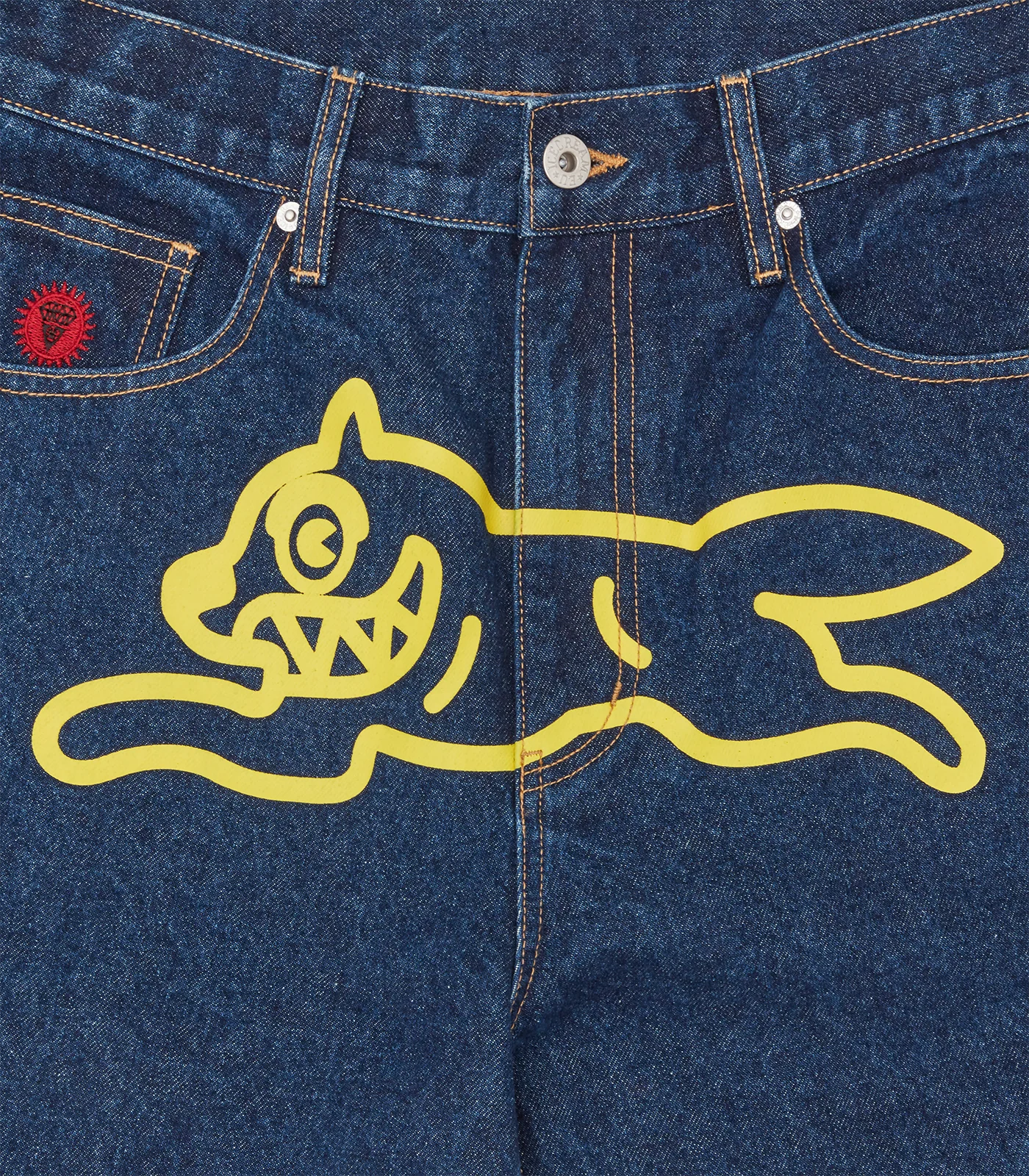 ICECREAM Fall '25 - Running Dog Denim Shorts, featuring the iconic screen-printed running dog graphic on the front, embroidered IC signet, embroidered "IC" lettering on the back pockets, and a zip-fastened fly.
