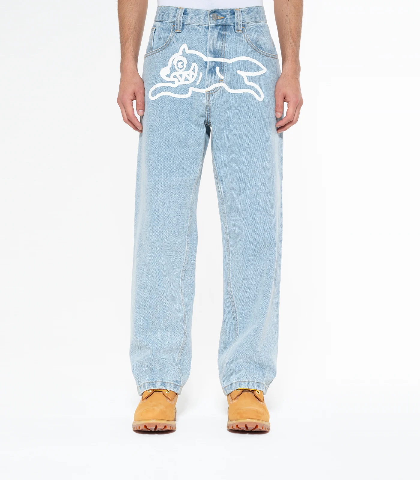 ICECREAM - Running Dog Double Scoop Denim Pants, feature a screen-printed running dog graphic on the front, embroidered double scoop signet and drip detailing on the back pockets, and a zip-fastened fly. Loose fit.