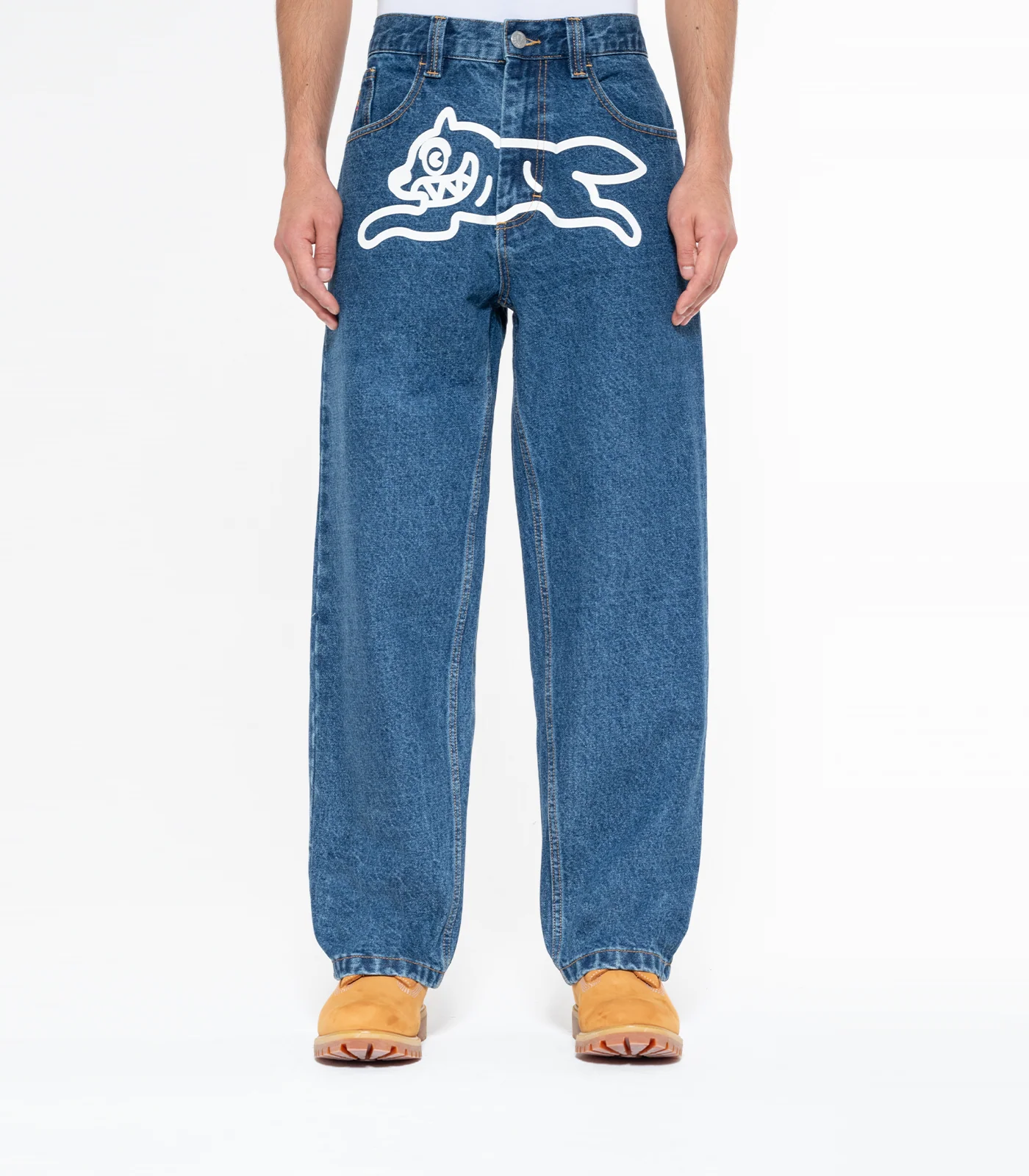 ICECREAM - Running Dog Double Scoop Denim Pants, feature a screen-printed running dog graphic on the front, embroidered double scoop signet at coin pocket and drip detailing on the back pockets. Zip-fastened fly. Loose fit.