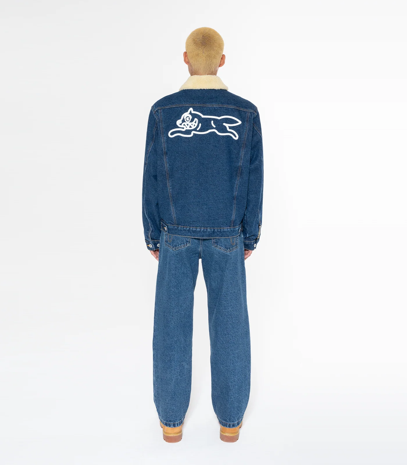 ICECREAM - This Sherpa Collar Denim jacket utilises an indigo denim for a vintage look. It presents a sherpa lined collar and a screen printed running dog graphic at the back.