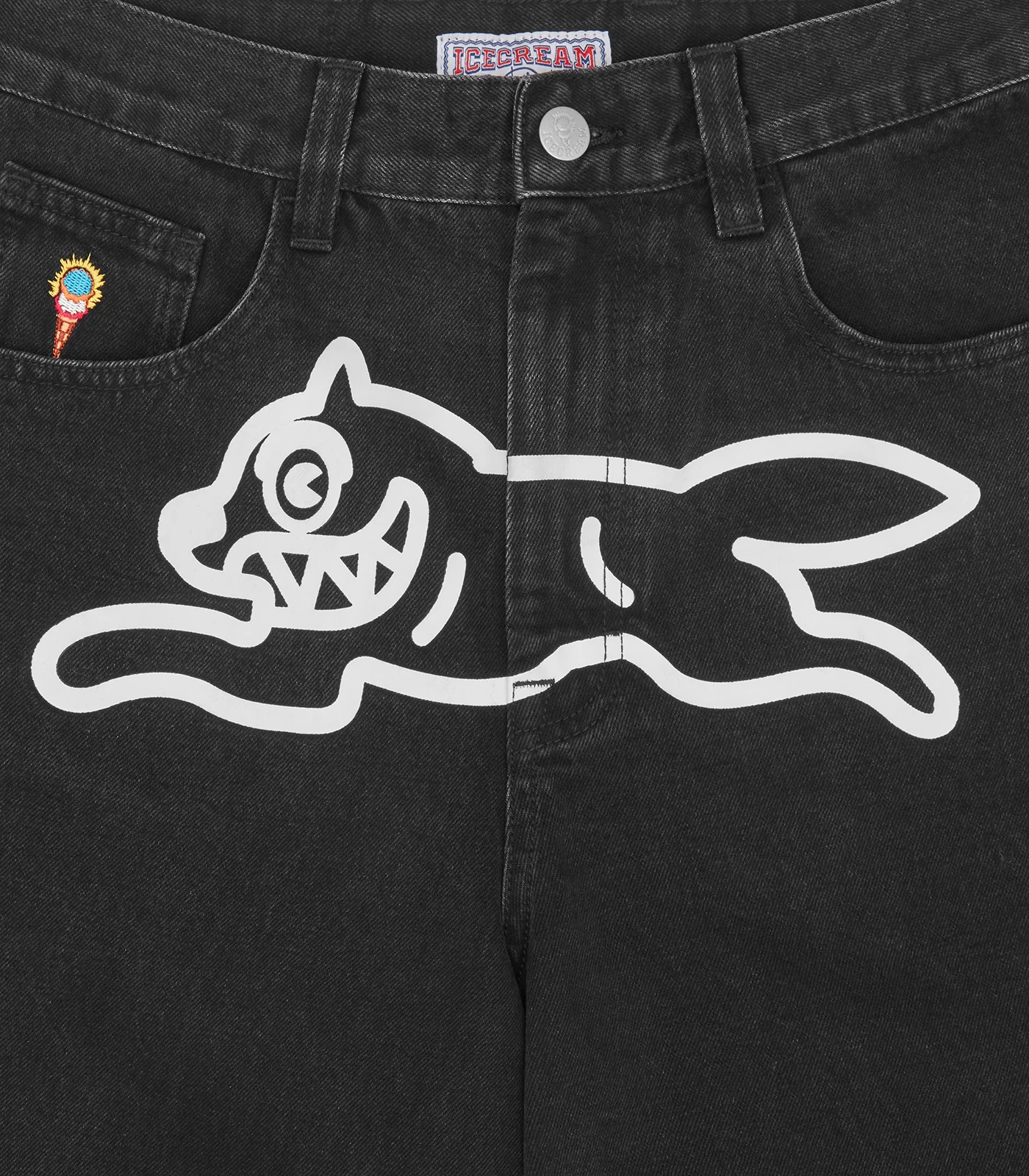 ICECREAM Pre-Spring '26 - Running Dog Triple Scoop Denim Pants, feature a screen-printed running dog graphic on the front, embroidered double scoop signet and drip detailing on the back pockets, and a zip-fastened fly.