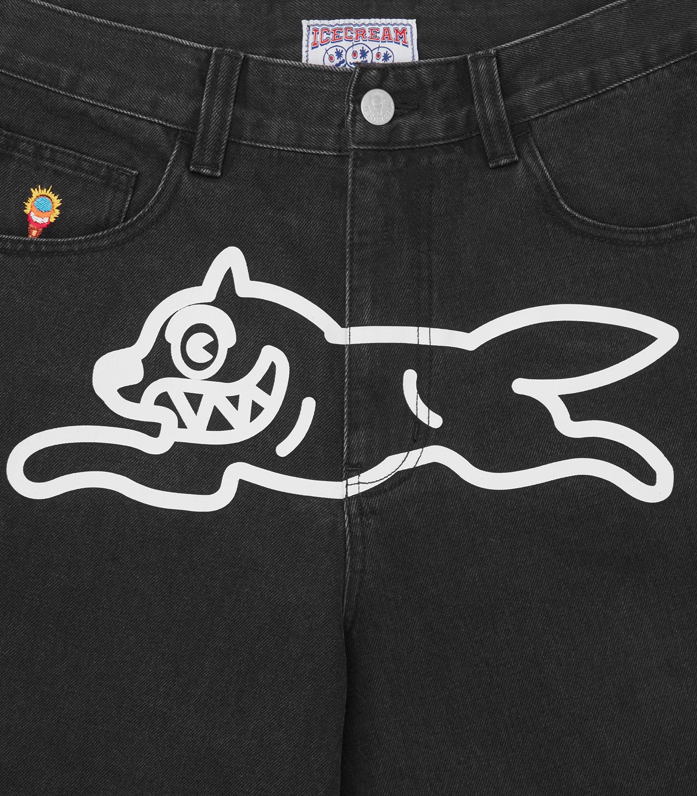 ICECREAM Fall '25 - Running Dog Triple Scoop Denim Pants, feature a screen-printed running dog graphic on the front, embroidered double scoop signet and drip detailing on the back pockets, and a zip-fastened fly.