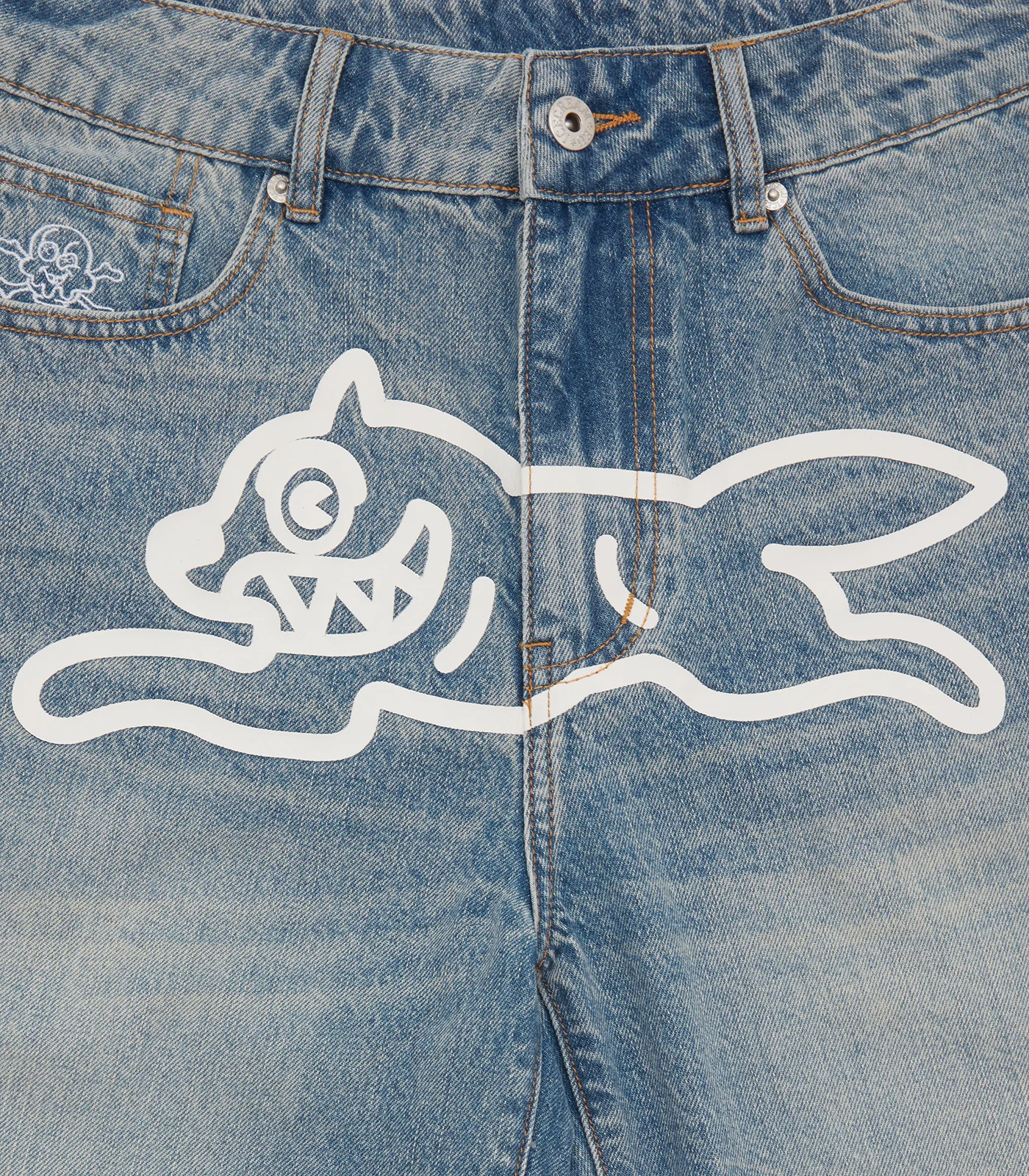 ICECREAM - Running Dog Denim Shorts, featuring the iconic screen-printed running dog graphic on the front, embroidered IC signet, embroidered "IC" lettering on the back pockets, and a zip-fastened fly.